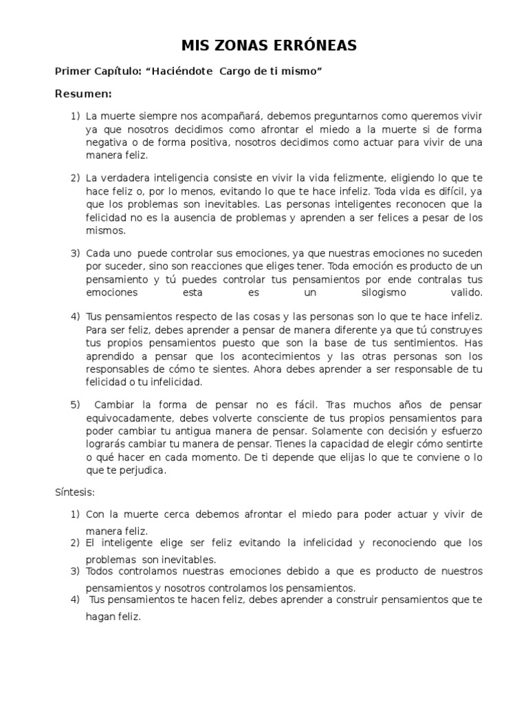 Resumen del Libro Tus zonas erróneas. Resumen de Tus zonas erróneas A través de doce puntos clave este libro de coaching resume las zonas erróneas de la mente humana y cómo liberarse de las mismas para alcanzar la felicidad. Haciéndote cargo de ti mismo Esto implica elegir cómo te sentirás en cada situación.