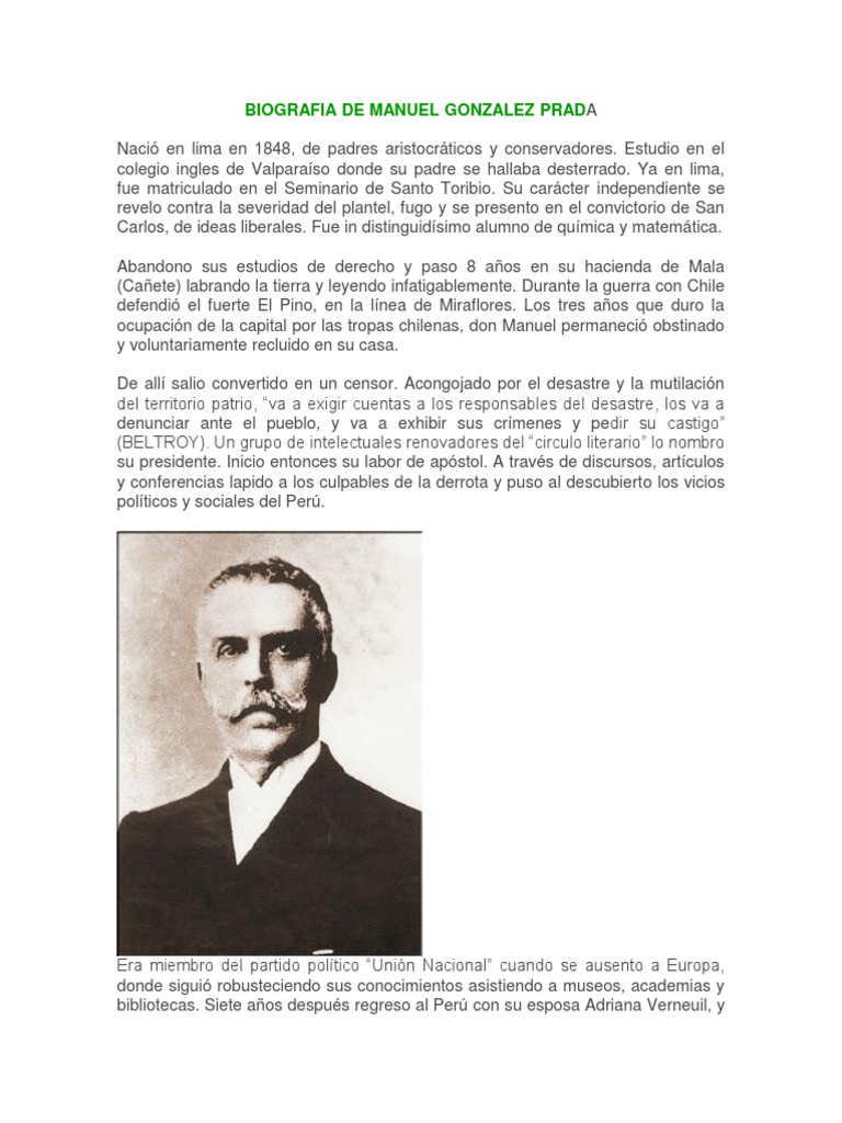 Manuel gonzales prada biografia resumen. Biografia de manuel gonzales prada. Nada notable ocurre en su infancia i sólo merece consignarse que después de recibir la instrucción primaria en la Escuela Náutica de Paita se trasladó a Lima para continuar su educación en el colejio del poeta Fernando Velarde. Nació un 20 de junio de 1833 en Matamoros Tamaulipas.