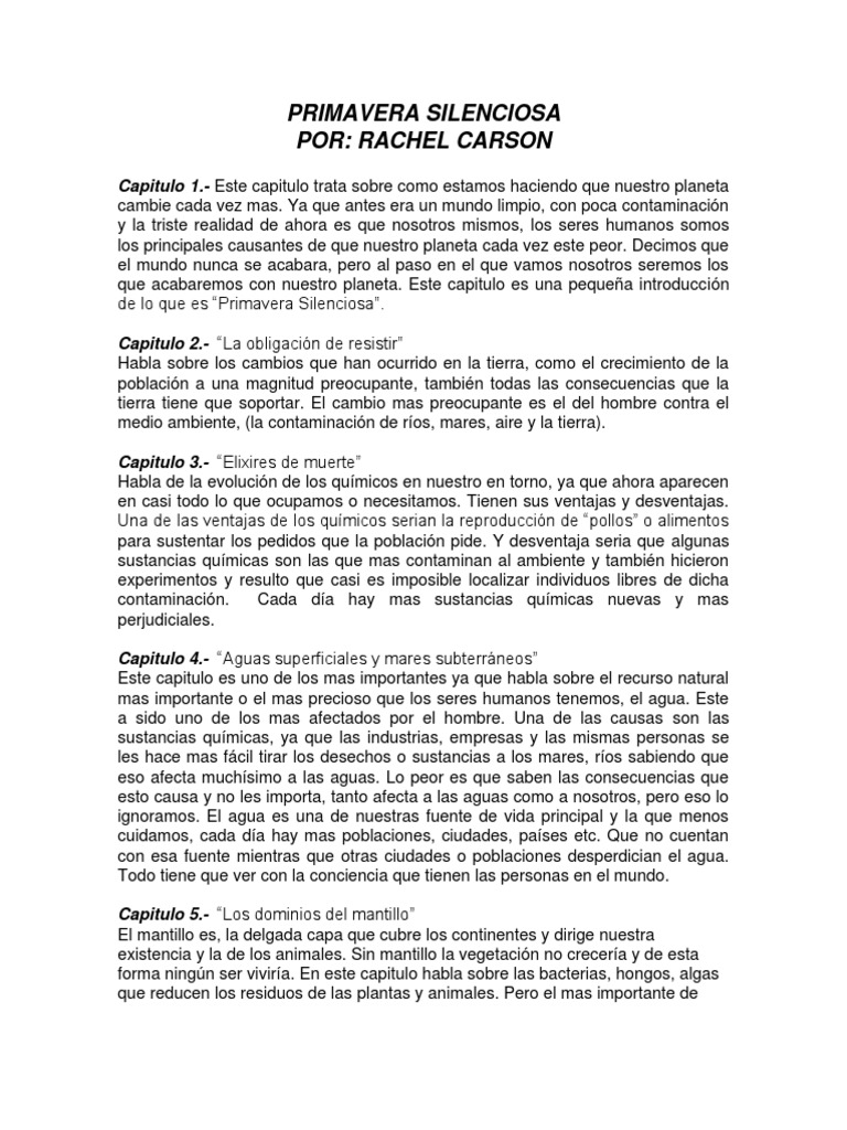Primavera silenciosa rachel carson resumen. Ad Top Resume Builder Build a Perfect Resume with Ease. La contaminación que sufre la Tierra. Dentro de la tradición ensayística estadounidense se conoce con el nombre de Primavera silenciona Silent Spring por su título en inglés a la obra más conocida de la bióloga marina y zoóloga Rachel Carson el cual fue publicado por primera vez en el año 1962 gracias al trabajo de la revista The New Yorker en donde apareció durante junio de ese año en tres diferentes entregas publicadas.