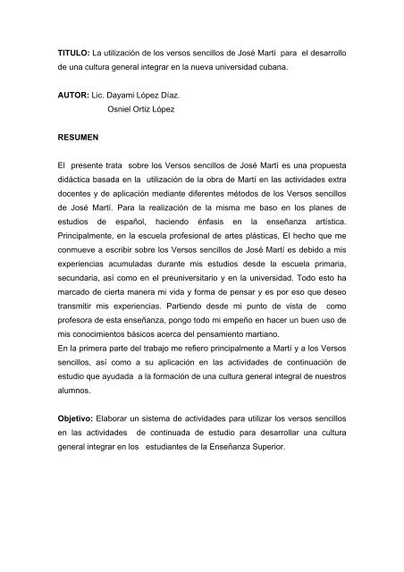 Favorable in the motivation and participation in the classes and in the investigation on José Martis life and work. Un esclavo muerto colgado a un ceibo de monte p. El 13 de diciembre de 1890 por primera vez los compartió con unos amigos sin embargo por su universalidad a la distancia de 126 años llegan hasta hoy vigentes y llenos de enseñanzas.