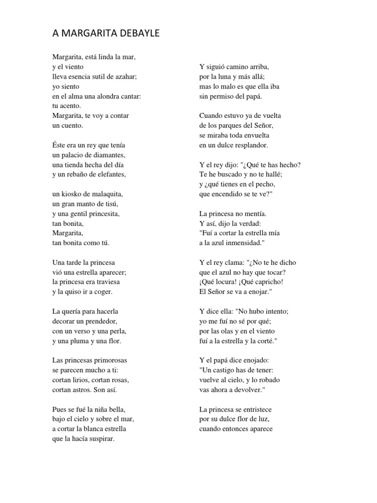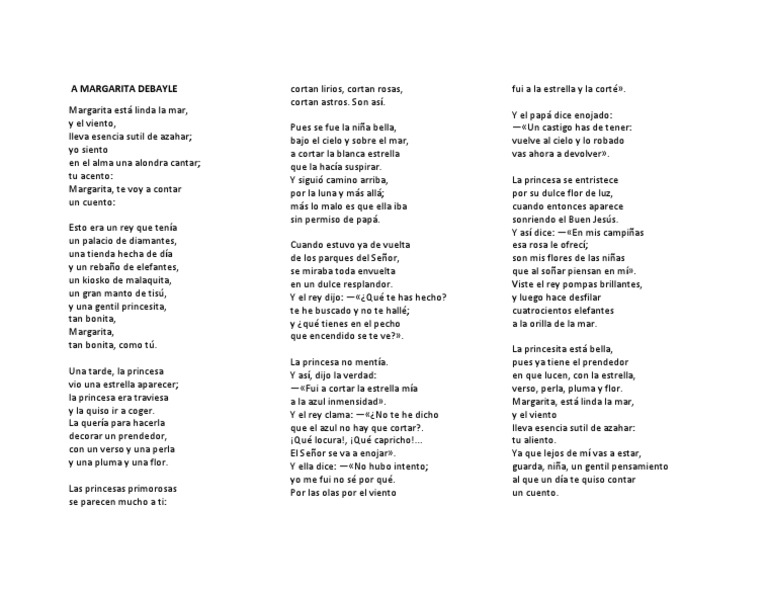 Yo siento en el alma una alondra cantar. Margarita está linda la mar y el viento lleva esencia sutil de azahar. A margarita debayle A MARGARITA DEBAYLE Margarita está linda la mar 10 sílabas 9 1 y el viento 3 sílabas lleva esencia sutil de azahar 10 sílabas 9 1 yo siento 3 sílabas en el alma una alondra cantar 10 sílabas 9 1 tu acento 3 sílabas Margarita te voy a contar 10 sílabas 9 1 un cuento 3 sílabas Esto era un rey que tenía 8 sílabas un palacio de diamantes 8 sílabas.