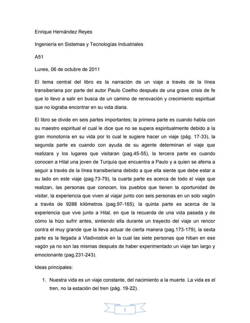 En su viaje conoció a Hilal una joven violinista a la que amó y tracionó 500 años antes. Enrique Hernández ReyesIngeniería en Sistemas y Tecnologías IndustrialesA51Lunes 06 de octubre de 2011El tema central del libro es la narración de un viaje a través de la línea transiberiana por parte del autor Paulo Coelho después de una grave crisis de fe que lo llevo a salir en busca de un camino de. Un entorno duro y claustrofóbico que pondrá a prueba las reacciones del protagonista y le abrirá a una forma renovada de relacionarse con las personas que le rodena.