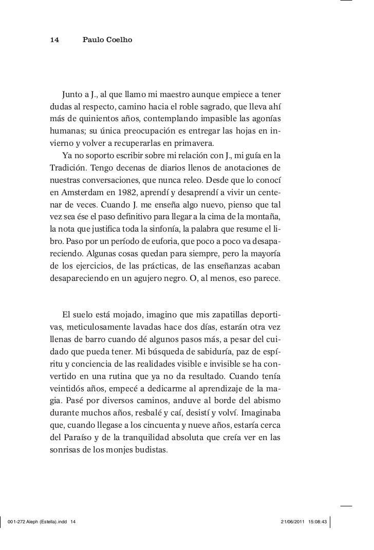 Un entorno duro y claustrofóbico que pondrá a prueba las reacciones del protagoni sta y le abrirá a una forma renovada de relacionarse con las personas que le rodena. A 14 de marzo de 2012 Aleph Esta historia comienza en el momento en que el escritor Paulo Coelho siente que su vida ya llego un punto en el cual el ya no tiene que escribir que la rutina lo agobia y que ya llego a sus límites pero su maestro J. Es decir que es una obra de - por qué se a veces separar a los personajes de sus autores digamos rea- les.