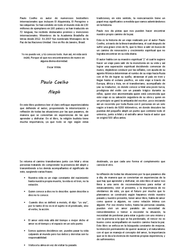 Aleph es la novela más personal de Paulo Coelho en la que el autor comparte su propia búsqueda del camino de renovación y crecimiento espiritual. En Aleph el lector acompañará a Paulo Coelho en un revelador viaje de casi diez mil kilómetros dentro del tren Transiberiano. Ad Top Resume Builder Build a Perfect Resume with Ease.