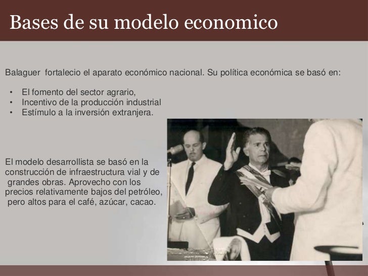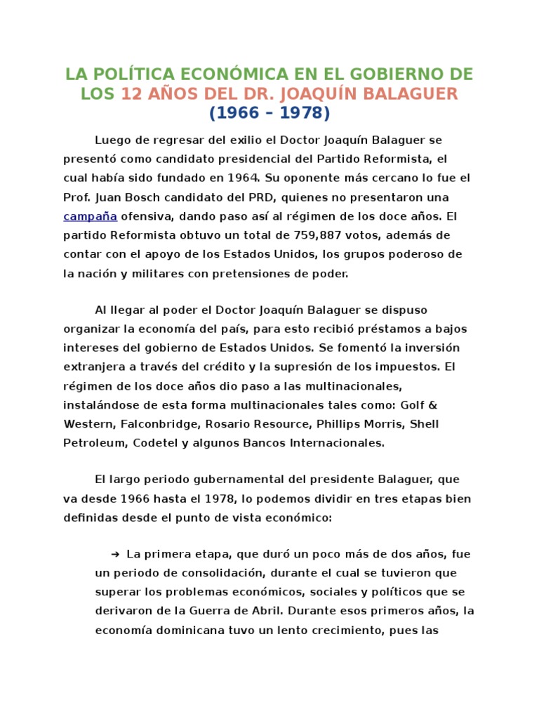 Política económica de los 10 años de Balaguer. El gasto público fue dirigido a la expansión y el crecimiento centrado en la construcción. Los doce años de Balaguer Esta etapa de la nación dominicana empezó en el 1966 cuando Balaguer derroto a los partidos de izquierda.
