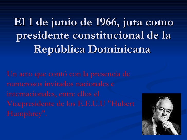 El 1 de junio de 1966 jura como presidente constitucional de la República Dominicana Un acto que contó con la presencia de numerosos invitados nacionales e internacionales entre ellos el Vicepresidente de los EEUU Hubert. Los doce Años de Joaquín Balaguer. La violencia impidió que el PRD pudiera hacer campaña libremente por lo tanto la candidatura de Joaquín Balaguer gozó de plena libertad.